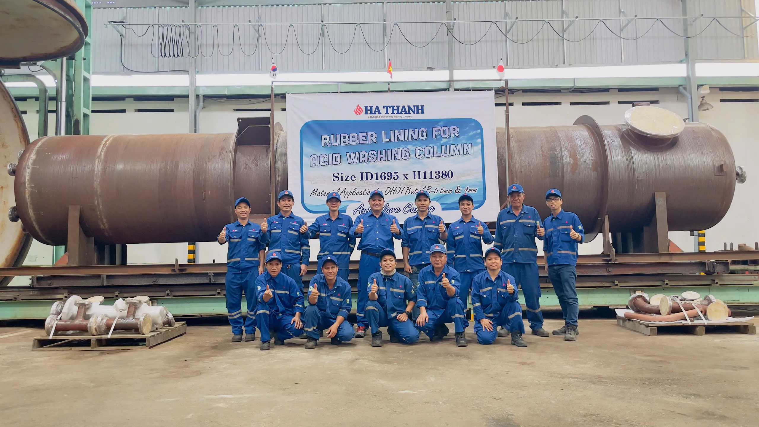 Cùng với đội ngũ chuyên gia và kỹ thuật viên cao cấp có trình độ chuyên môn cao, dày dạn nhiều năm kinh nghiệm từ hãng Cao su và hóa chất OHJI (Nhật Bản) hướng dẫn, chỉ dạy bài bản trong nhiều năm liên tiếp cho đội ngũ kỹ thuật viên Hà Thanh những kiến thức và bí quyết lót dán cao su. Đến nay Công ty Hà Thanh đã tiếp thu được kỹ thuật, kỹ năng, kinh nghiệm lót dán cao su tiên tiến và khoa học của Nhật Bản đã có được các cơ sở năng lực sản xuất tại Nhà xưởng.